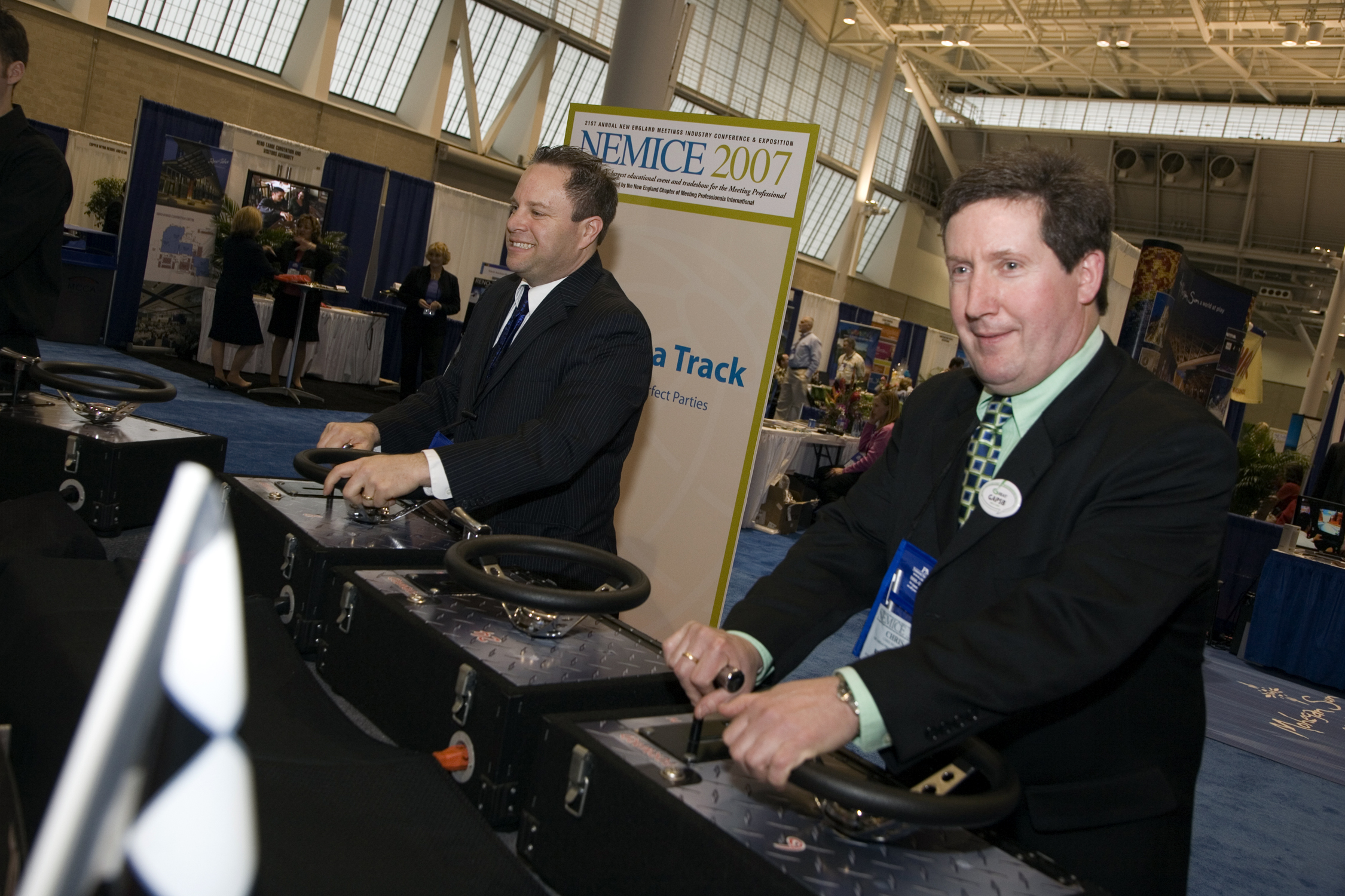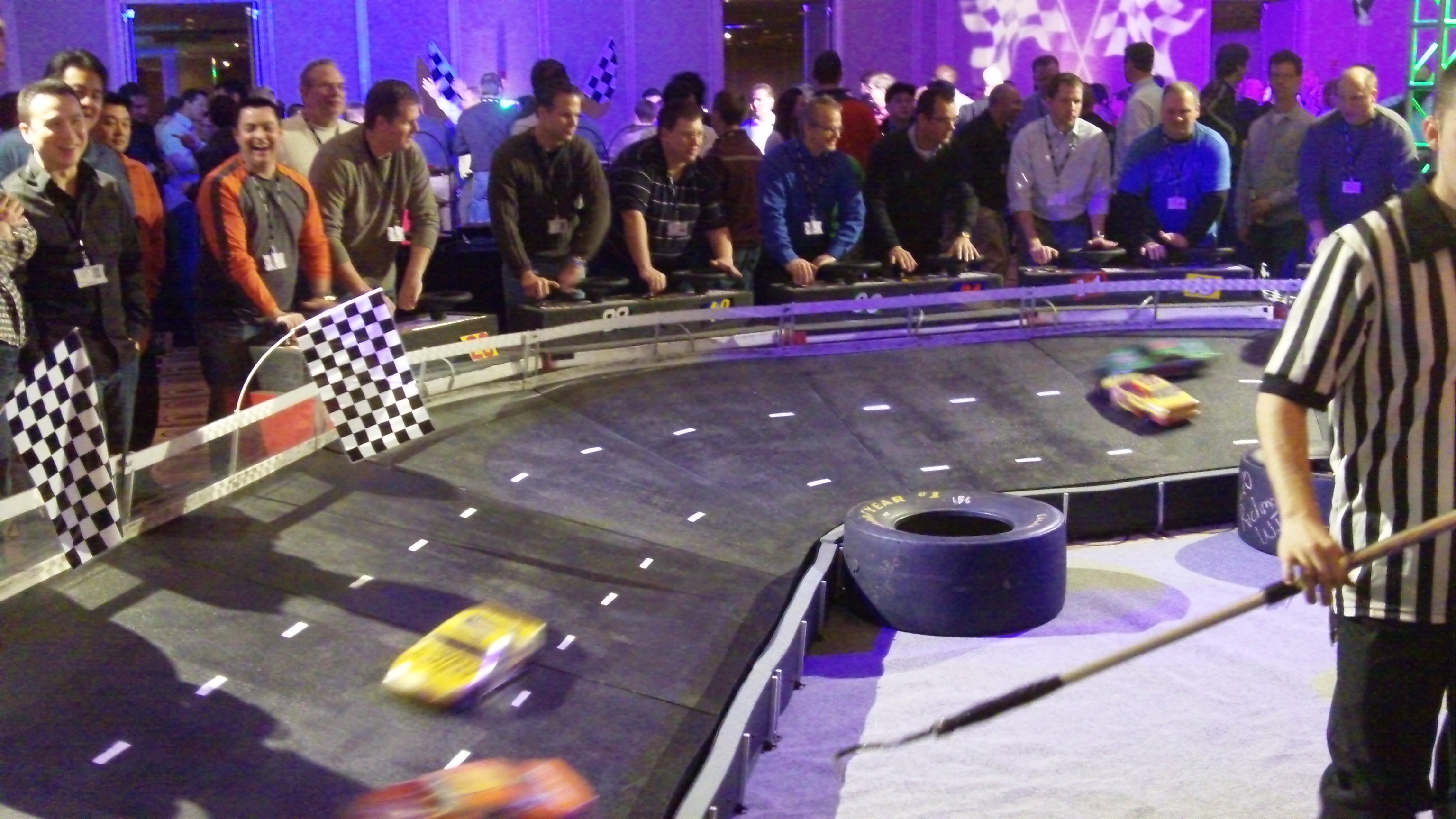 Introducing our 1/10th scale version of NASCAR in action. A 28'x16' oval speedway comes complete with six stock cars and six driving stations. Full size steering wheels, driving shifter, and digital time clock make this racing experience realistic. Take part in the spectacular crashes, high speed spinouts, rail bumping, and burning rubber of real stock car racers. What an amazing traffic builder! Perfect for any kind of event, function or social gathering where you want maximum response and positive results! We also offer sponsor-branded or customized cars and race track to suit any clients need. Let our professional staff and pit crew show you how to put your next event in the winner's circle. Ask about our smaller tracks and monster truck mash.