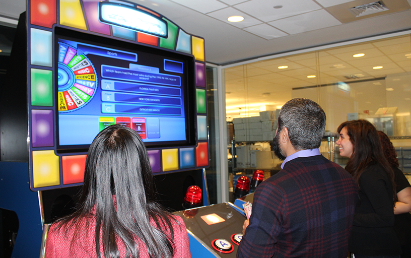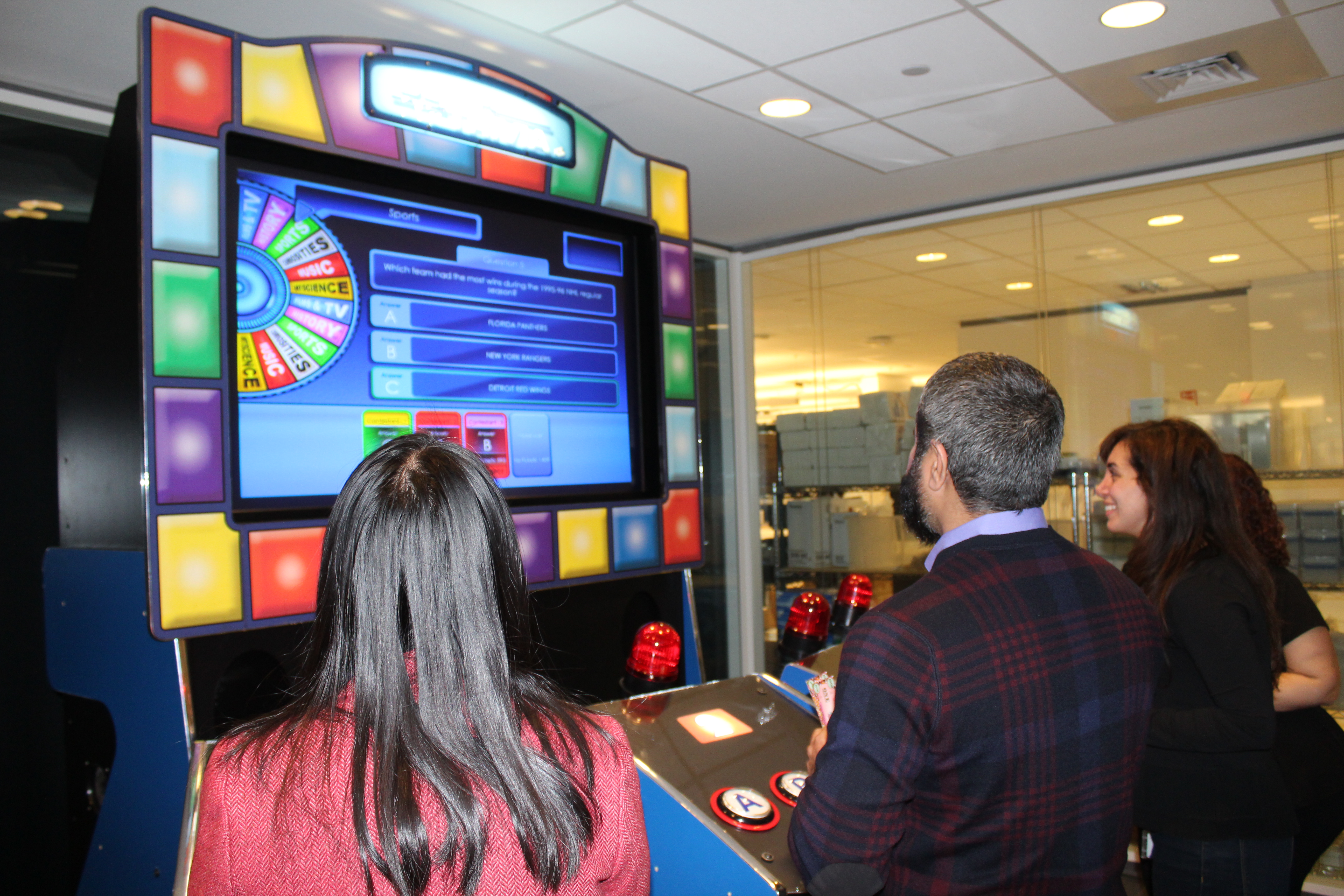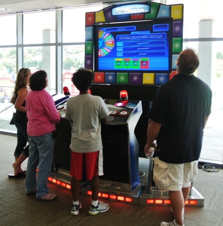 Test your smarts against your competition with our newest trivia game. The atmosphere is such that you actually feel as though you are competing on a game show. This is a high impact game that will create a competitive frenzy at any event. One to four players can play simultaneously. 6 different categories - Sports, History, Curiosities, Film/TV, Music, Science/Arts. The game consists of 5 different questions with three possible answers. The winner is the player that answers the most questions correctly in the shortest time. This game is ideal for any tradeshow, college event, high school over night or promotion looking to add a very unique impact piece. We also have the ability to add in custom logos or commercials between rounds.