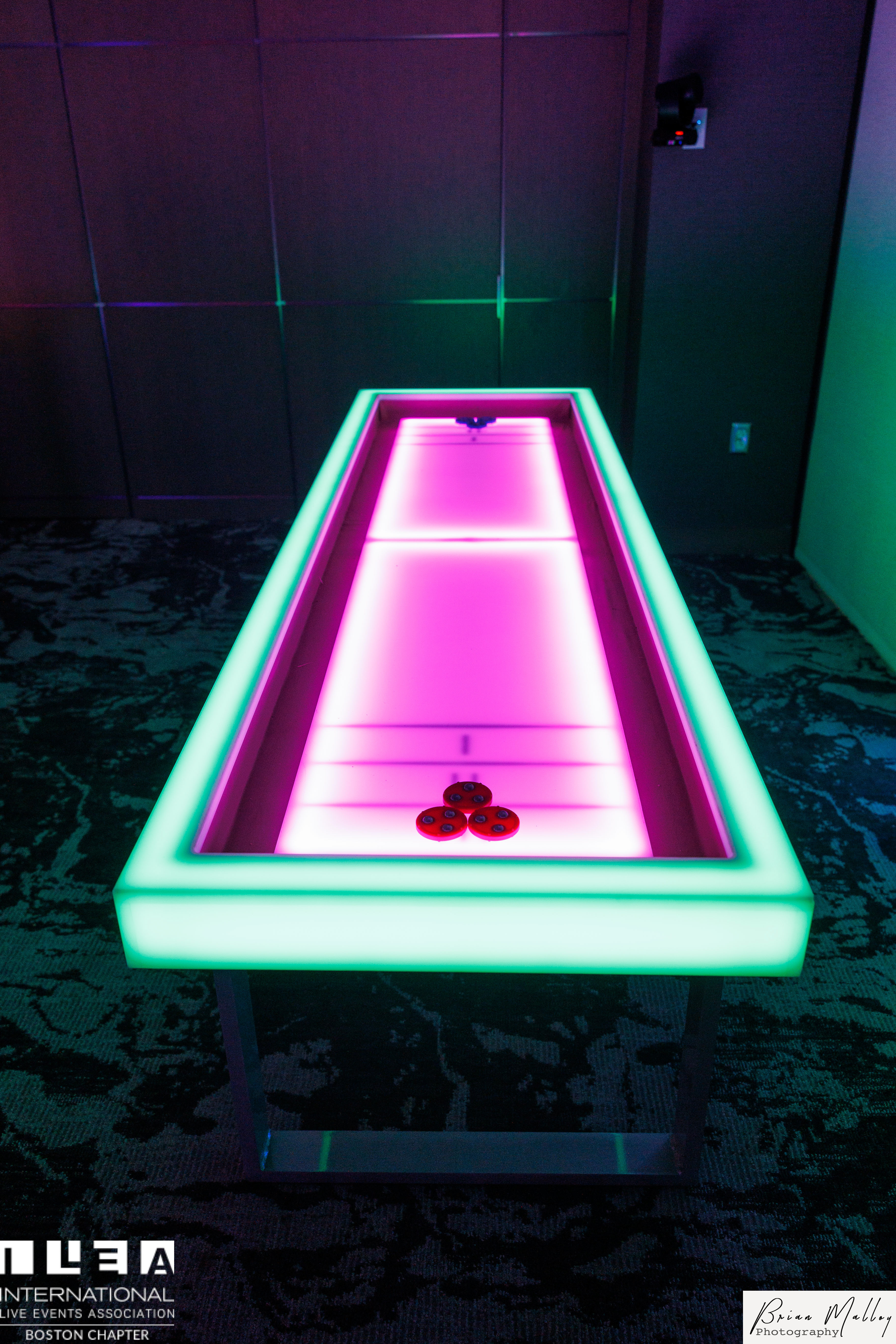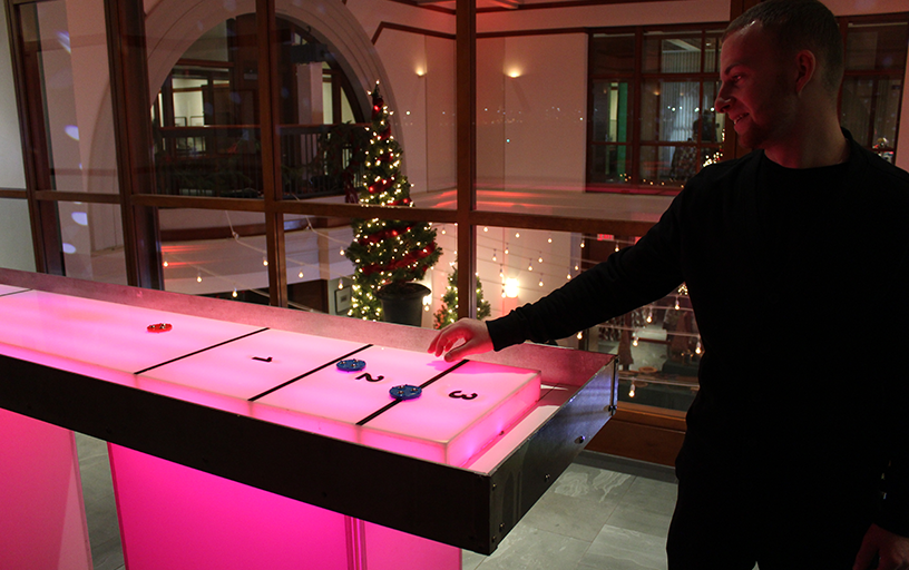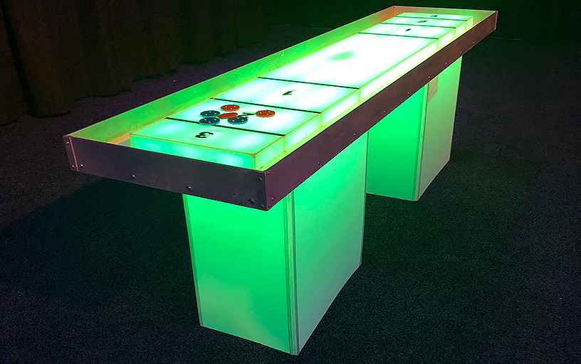 Shuffleboard is a game that has been around for years, but never like this! Our LED Glow Shuffleboard game transforms colors in front of your eyes. Glide your disc to the lit up scoring diagram in an attempt to score or prevent points from your opponent. No experience necessary, smiles and laughter required!