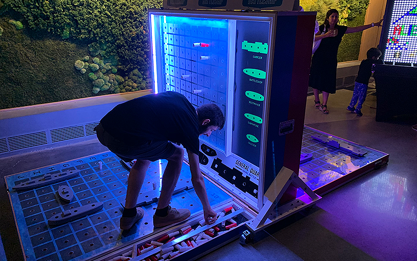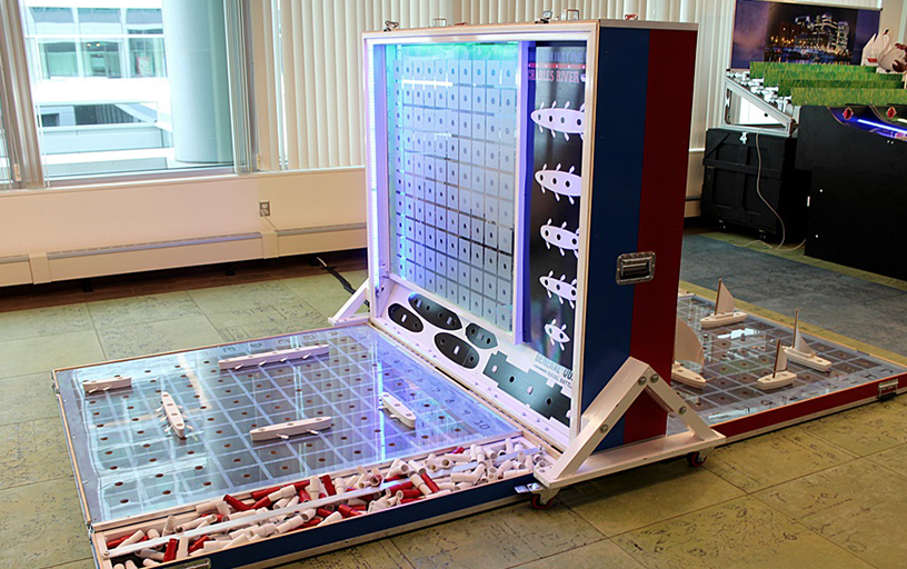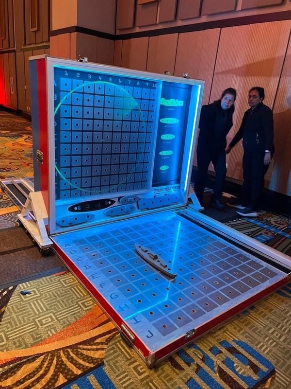Ahoy Mate! A loved classic game of Battleship supersized for your enjoyment! This game is larger than life and you actually have to walk on the game board to put your pegs in the coordinates. The led lights make this a great addition to any glow game package or low lighting event. Try to sink your opponents battle ships before yours are sunk!