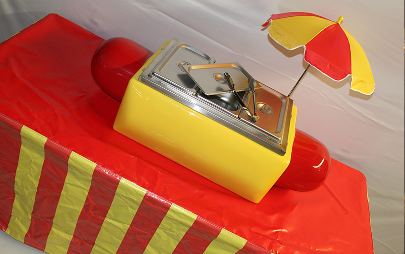 Get your hot dogs here! This eye catching design will capture the attention of all your guests and they won't be able to resist a mouthwatering hot dog! Hot dog supplies are an additional cost.