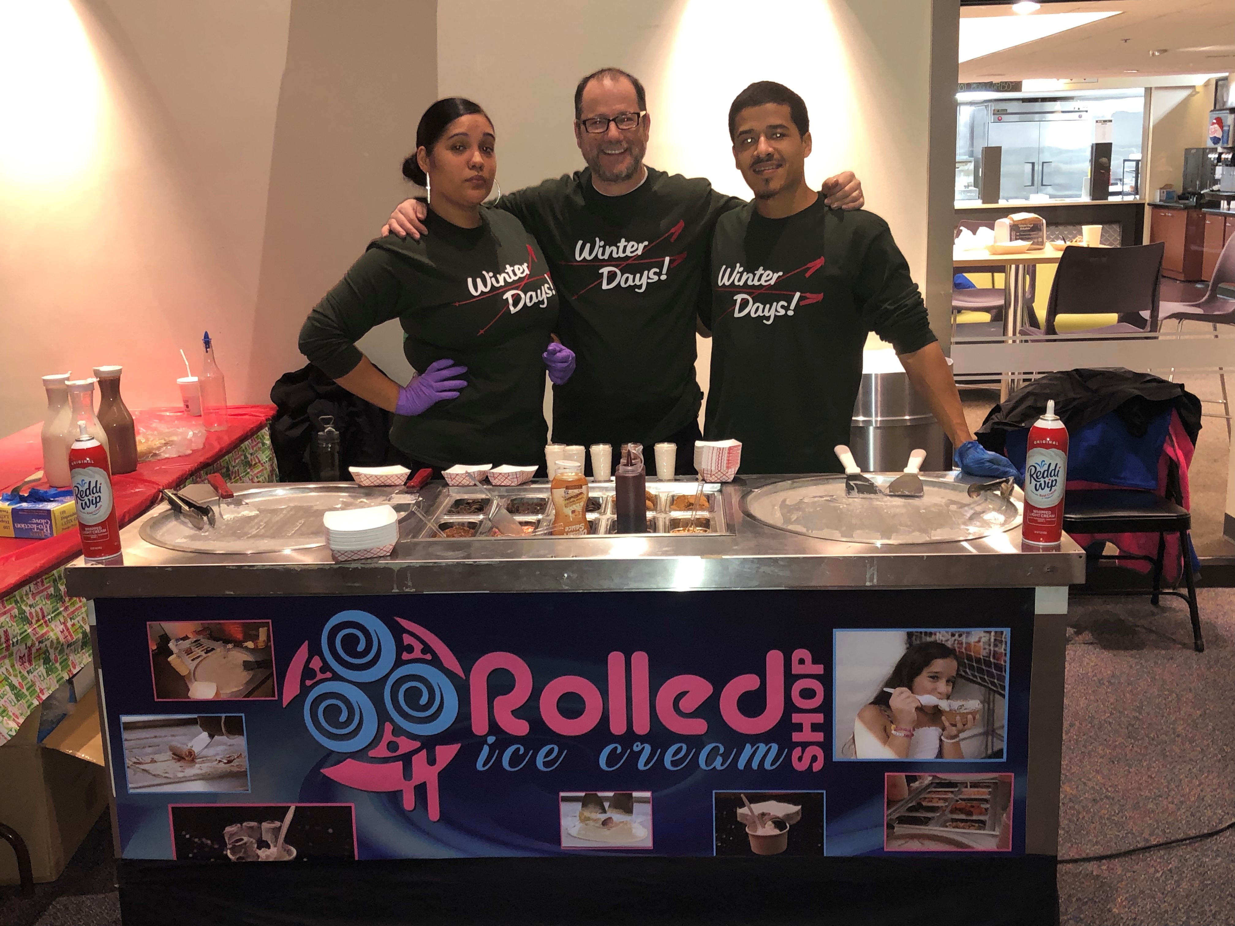 Our newest service, and the current "fun food" craze, is Rolled Ice Cream, which is also known as Thai Style Ice Cream. This is a made-to-order dessert which is created by pouring a cream base onto a sub-zero temperature freezing plate. The extreme cold causes super fast freezing which produces a smooth, creamy texture unlike conventionally made ice cream. Each guest then chooses the toppings, which are chopped into the semi-frozen cream. The concoction is then flattened and allowed to freeze completely on the plate. The grand finale is watching the rolling artist scrape it off the plate in sections that form graceful, delicate, and enticing rolls that are individually placed into a cup. The finished treat is a masterpiece for the guests' eyes and taste buds to savor!