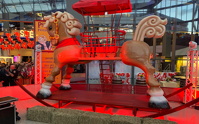 This giant attraction is a fully functional rocking horse that can accommodate 4 riders at a time. The rocking motion of this oversized beast guarantees to attract a crowd anywhere it goes and is a sure thrill for its unsuspecting passengers. It is intricately hand carved and is the envy of any carousel horse with its detailed swirls, shimmering paint and chiming bell sash. Standing at over 15 feet tall, 24 feet long and 8 feet wide, this horse guarantees a supersized response at any event. Not only is the World’s Largest Rocking Horse a ride, it can also be a photo op that can be custom branded. The World’s Largest Rocking Horse appeals to the child in all of us and is perfect for that holiday event looking for added impact. We adorn our horse with holly, garland and an oversized Santa hat to rock you into the holiday spirit. The World’s Largest Rocking Horse entertains a crowd when in use since it has a 360 degree viewing area and it is suitable for every kind of shopper since it is not age or religion specific. Ride, Capture, Experience the World’s Largest Rocking Horse.