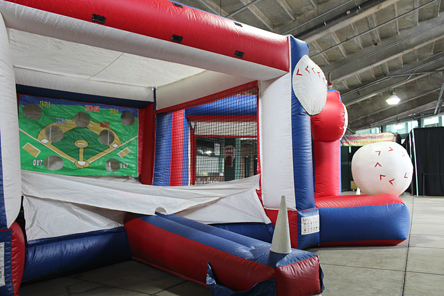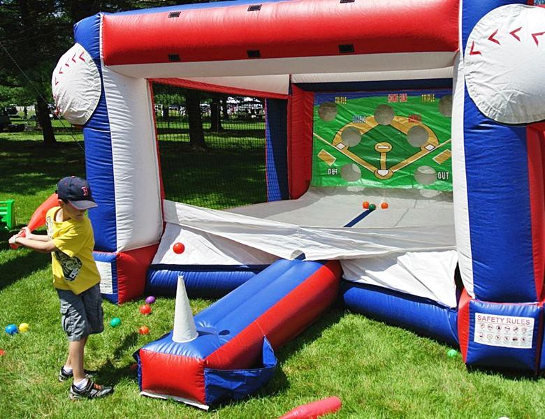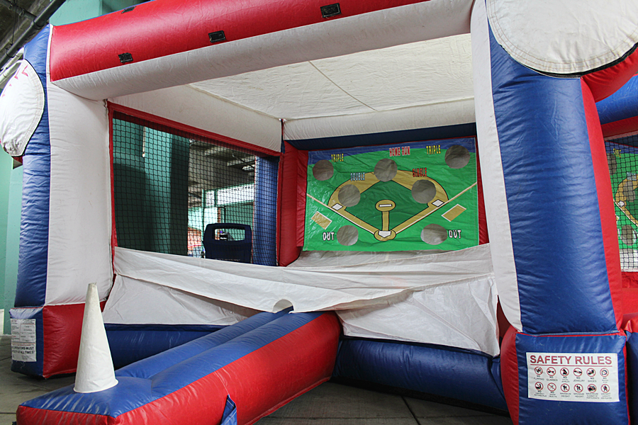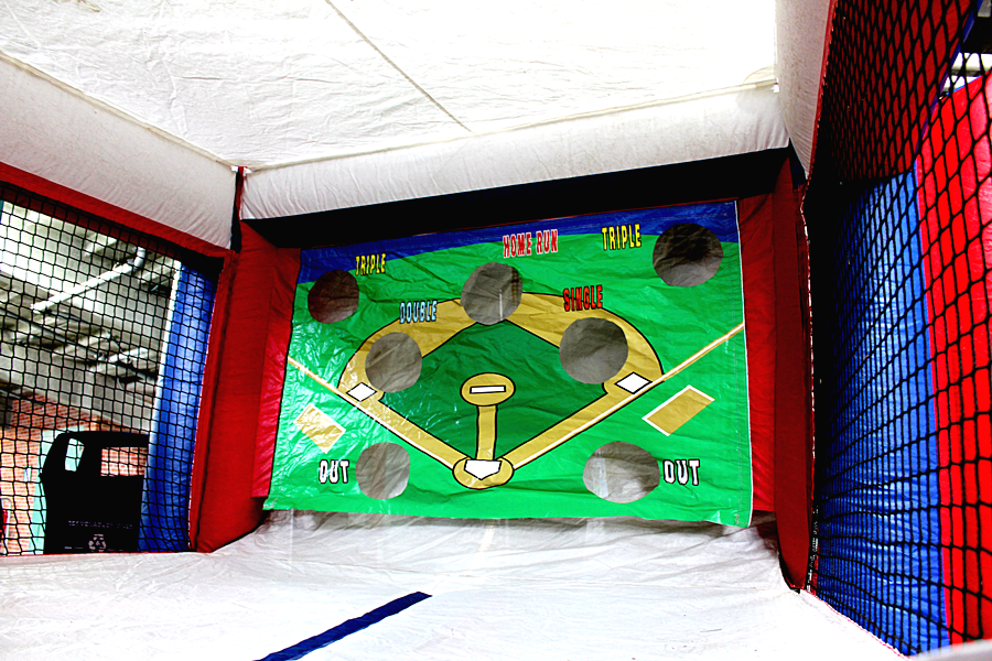 An air flow tube keeps a light weight baseball hovering in the strike zone while two batters swing for the fences of the inflatable arena. (2 player)