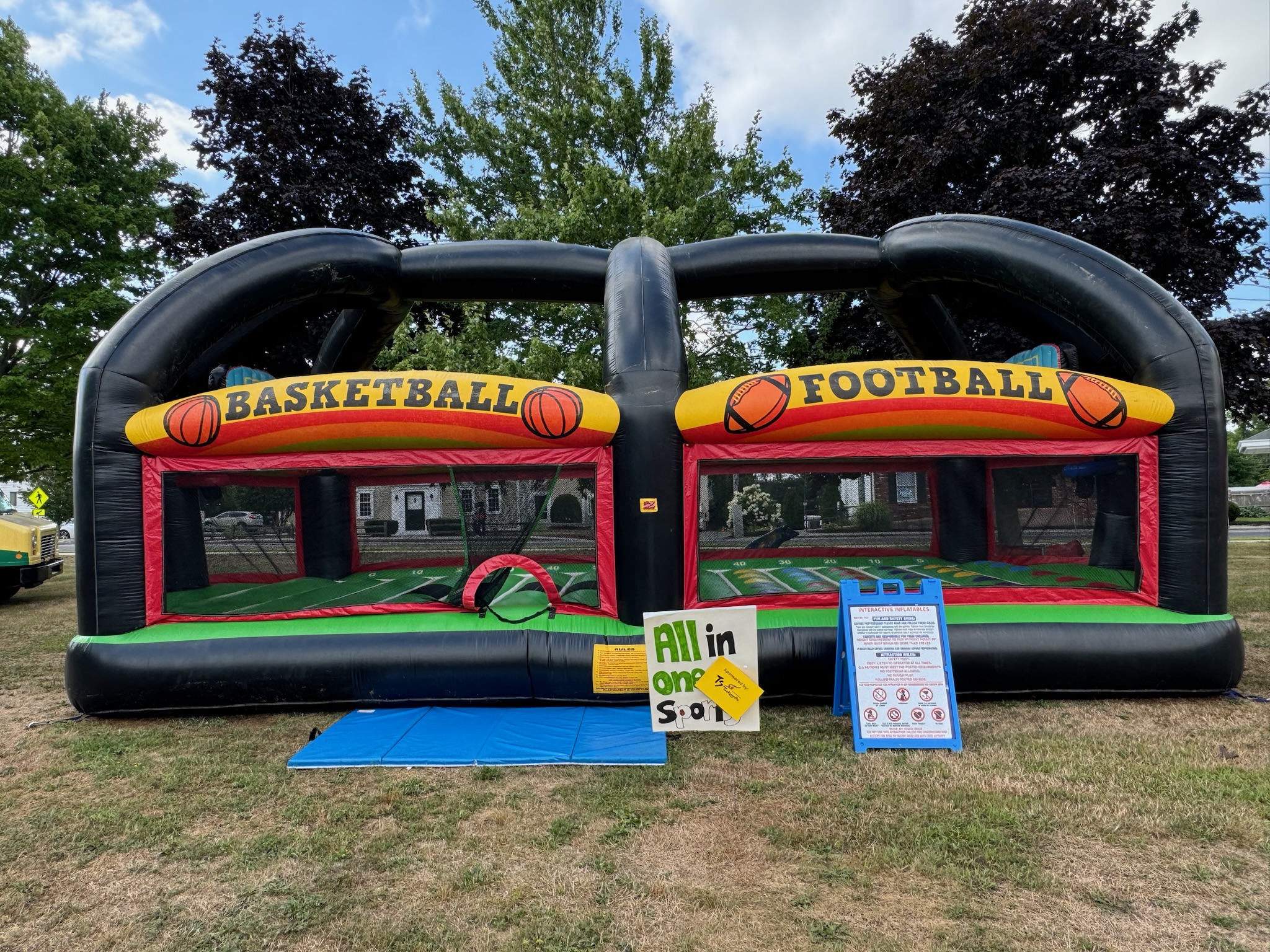 The new All in 1 Sports Arena™ inflatable game will satisfy any sports fan with eight different game choices! Enjoy traditional team sports such as basketball, football, and soccer, as well as gymnasium classics like dodgeball, first n' goal, and volleyball. For added adventure, game has set-ups for joust, and mesh sides allow for easy viewing of the playing field. Big fun is to be had with this All in 1 Sports Arena™!