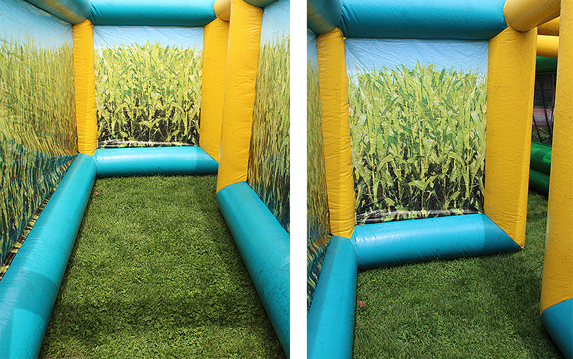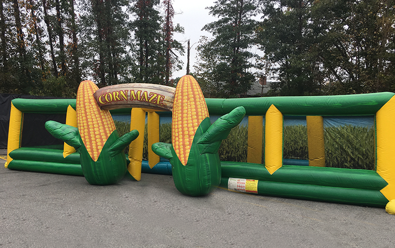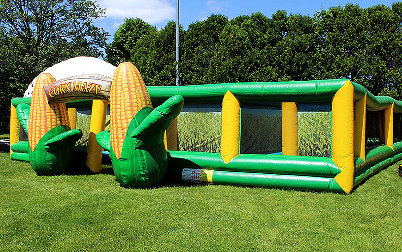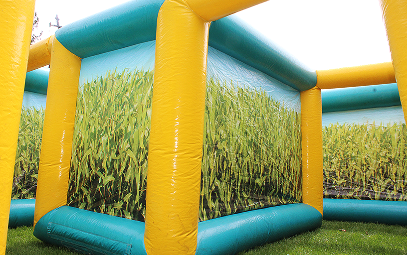 The highly popular corn maze now has a life like inflatable version to play in year round. The classic corn maze is a favorite activity, and now you can relive that joy at any event, during any season. Get lost in twists and turns until you finally find your way out. What direction will you choose in order to try to be the first one out? The inflatable corn maze includes full digital graphics of a real corn maze and a giant 11' 3-d corn entrance. Fun for any age group and the perfect high volume attraction you have been looking for.