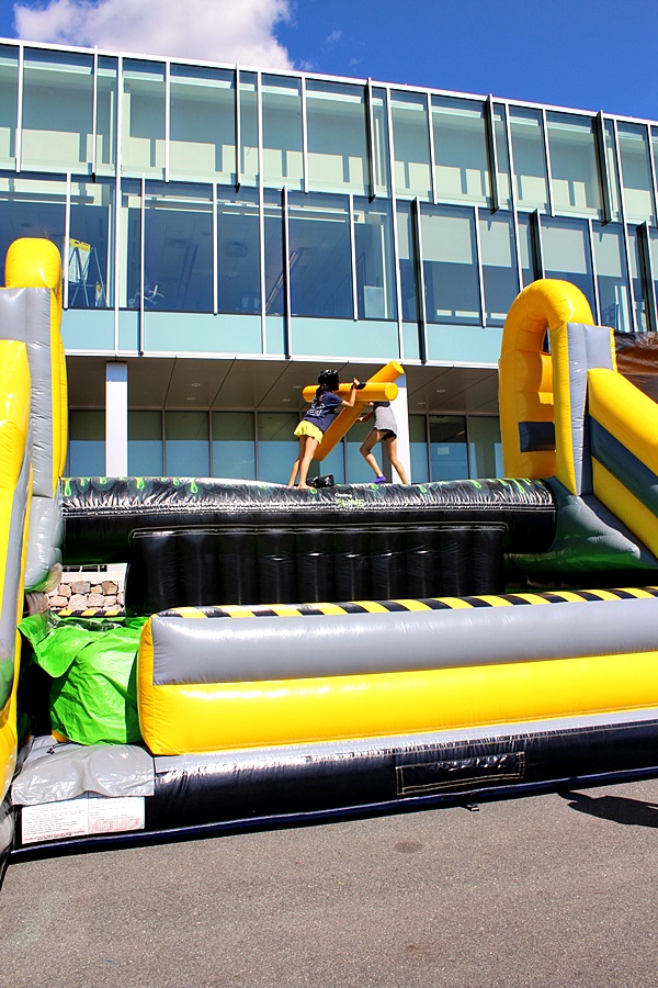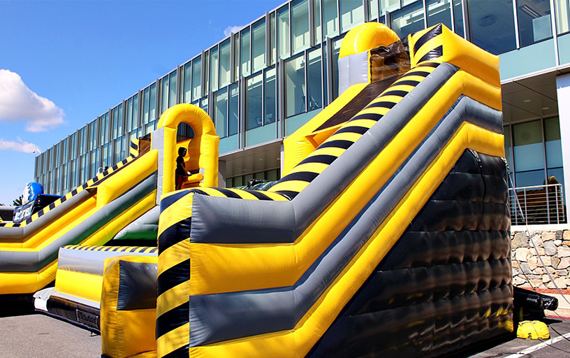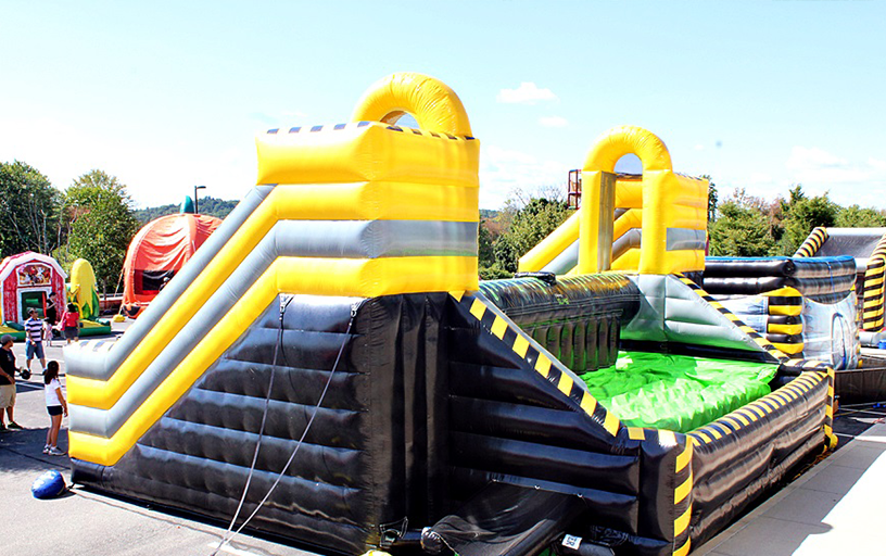 Throughout history, a jousting beam, in one form or another, has provided wild entertainment and competition for thousands of fans and competitors alike! Now for the first time ever, you have both the thrill of battling your opponent from great heights with the safety of falling on our air bag system. It starts off with families and friends combating one another, but by the end of the day, it has become a free-for-all with everyone wanting to take down the ‘King-of-the-Hill’. Participants stand on raised plank style beam and attempt to knock off their opponent onto a patented stunt airbag. The airbag system keeps participants safe and ready for another round. This item has large visual appeal and is perfect for colleges, street fairs and corporate events. It pairs well with our Leaps N' Bounds item and falls into the Ninja type sports game category.