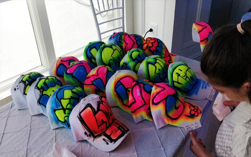 Our airbrush trucker hat artists magically paint names and other graffiti type artwork on hats, t-shirts, sweat pants and even boxer shorts while you wait. For added impact, ask about imprinted giveaways.