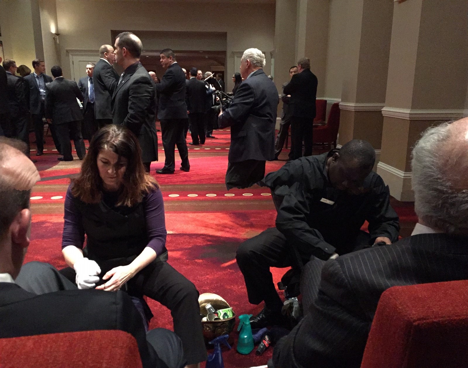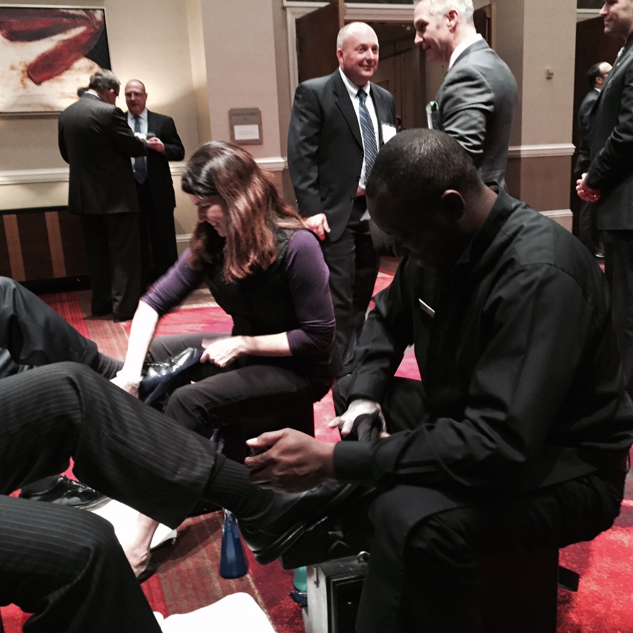 A must have at your next event or tradeshow booth. Our shoe shining service offers professional shoe shiners who will give a full scale shine to your shoes in the middle of your event! This is a major traffic builder at trade shows and a huge hit at any corporate event. Clients can provide their own bar stools or we can provide our custom shoe shining chairs for an additional fee.