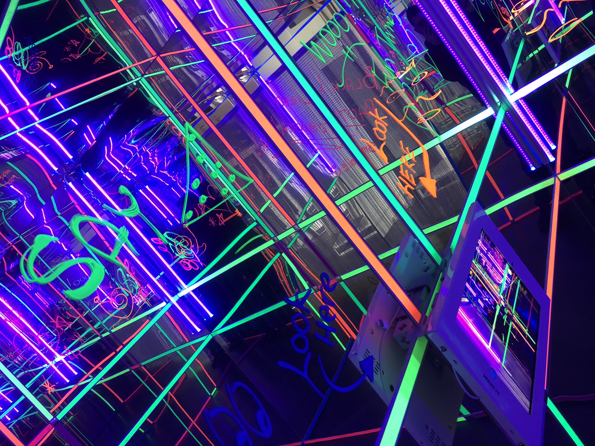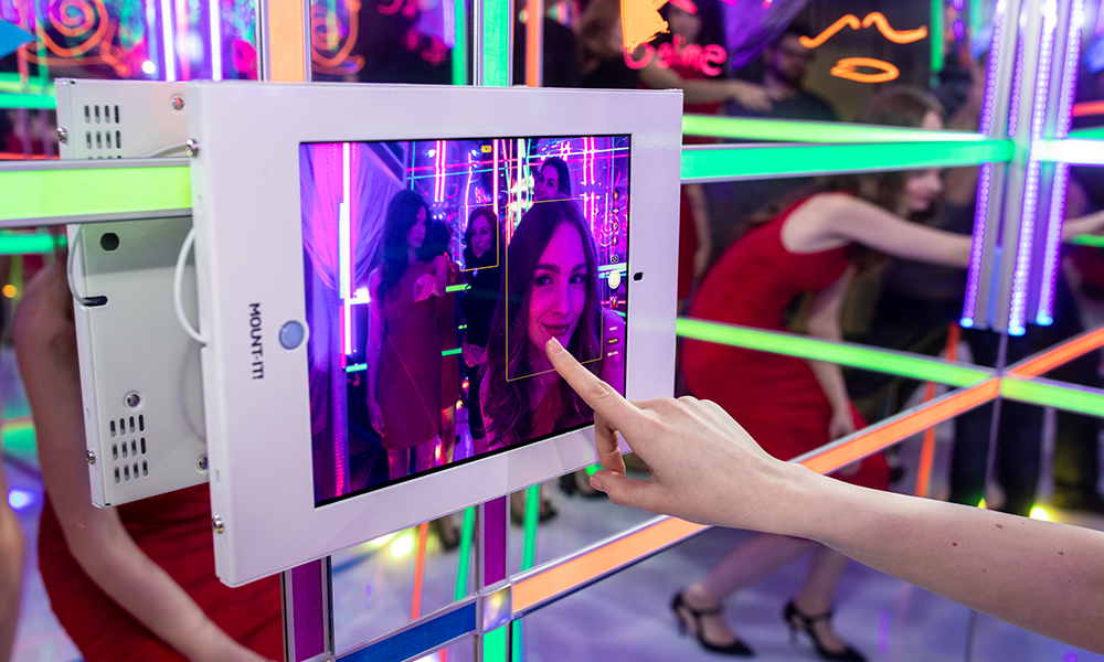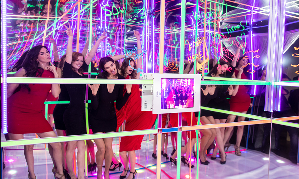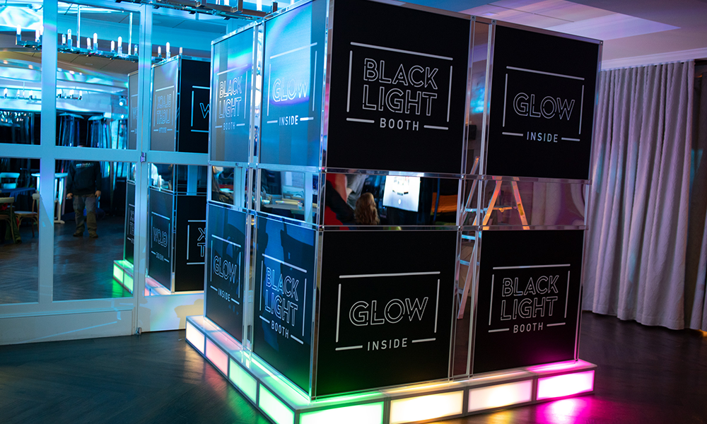 Experience our all new Black Light Photo Booth. This booth has an impressive 8’ X 8’ footprint so that it can accommodate large groups inside a glowing and mirror interior with reflections that go on forever. Not only can patrons check out how they look, the booth is also outfitted with led black lights and glowing strips to create an immersive and very chic photo affair. The booth sits atop a glimmering base and guests can also write personalized messages with glow markers on the interior walls for all to see. All exterior panels are customizable so we can personalize the look and feel to match your event or brand. Digital photos are taken and shared via the touch screen panel and can be easily customized. Ask about including glow props and black light face paint for even more interaction. This booth guarantees to light up your next event and is HOT!