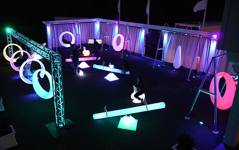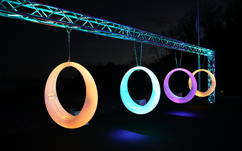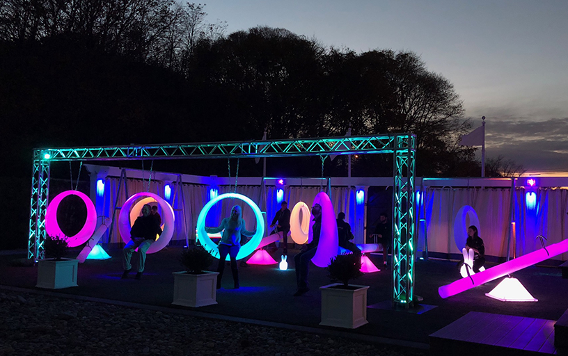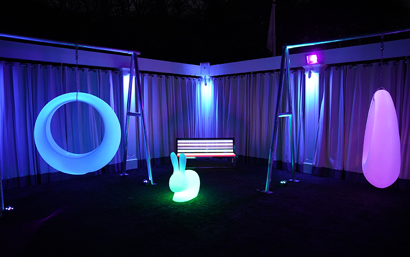 Our After Dark Park varies per spacing permitted but includes a 30ft lit truss structure with 4 swings, glowing rabbits, bears, stars, see-saws and other illuminating objects. The park creates a magical wonderland of glow and creates that chic Miami vibe at any event and in any location. The park produces the perfect ambiance and great photo ops. Ask about adding music, glow bocce courts, l.e.d arcade games and our all new Black Light Photo Booth for a complete lights out experience!
